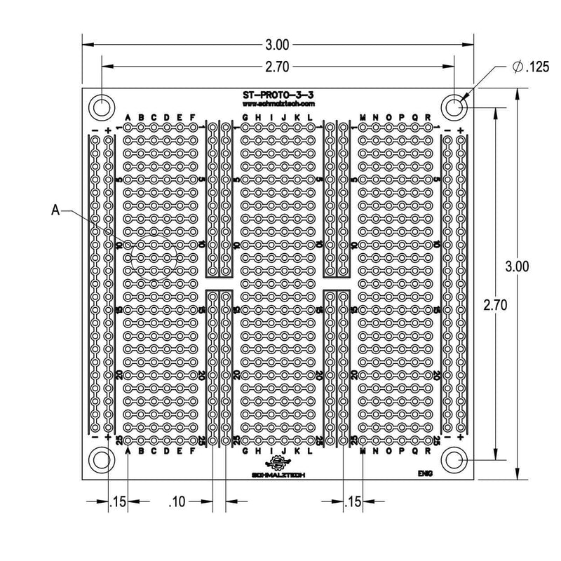This protoboard is the perfect tool for quickly prototyping an electronic circuit or turning a breadboard prototype into something more permanent. These boards have an ENIG surface finish and are made from high quality FR4 which can withstand high temperature soldering and re-work. The holes on this prototyping PCB have a standard 0.1" pitch to enable compatibility with a large variety of electronic components. The space between the power rails and the adjacent rows is 0.15". Each hole is electrically connected to a row of holes to make building circuits fast and easy. See the drawing below for a detailed view of the electrical connections on this board. Both sides of this board have solder mask, making it easier to control solder flow and prevent unintentional bridges.