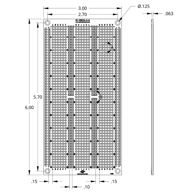 This protoboard is the perfect tool for quickly prototyping an electronic circuit or turning a breadboard prototype into something more permanent. These boardsĀ have an ENIG surface finish and are made from high quality FR4 which can withstand high temperature soldering and re-work. The holes on this prototyping PCB have a standard 0.1" pitch to enable compatibility with a large variety of electronic components. The space between the power rails and the adjacent rows is 0.15". Each hole is electrically connected to a row of holes to make building circuits fast and easy. See the drawing below for a detailed view of the electrical connections on this board. Both sides of this board have solder mask, making it easier to control solder flow and prevent unintentional bridges.