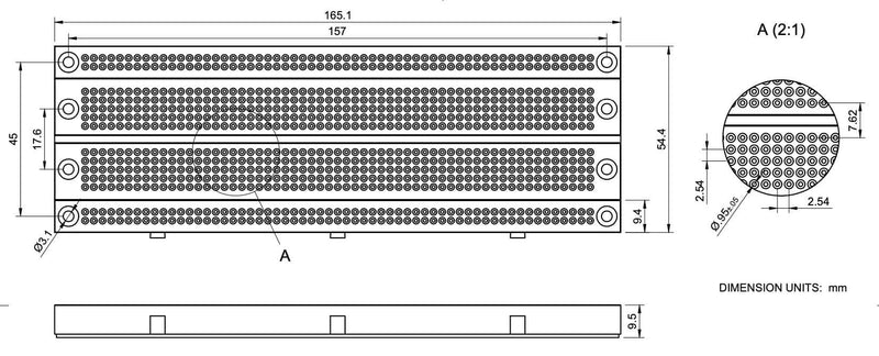 This premium breadboard is the perfect tool for quickly prototyping electronic circuits. Made of heat resistant, high quality ABS plastic and premium nickel plated electrical contacts this breadboard has excellent mechanical and electrical performance. Each row of five holes is electrically connected as well as each of the four full length power rails, making circuit creation fast and easy. This breadboard also features eight 3.1mm mounting holes along with an adhesive backing making it possible to securely mount it in any location. Multiple ST-BB-770 breadboards can be hooked together via the interlocking clips along the side of the board making it possible to expand your prototyping area as necessary. Please see the dimensioned drawing for more details regarding hole size and spacing.