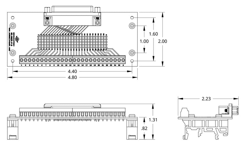 This female DB25 breakout board provides a convenient method of accessing all the contacts of a 25 pin D-Sub connector. Each of the 25 connections as well as the shield are brought out to a screw terminal for fast and secure termination to wires. This board also features a prototyping area to enable in-circuit modifications as well as easy probing/diagnostics. The prototyping grid has a standard 0.1" pattern to enable compatibility with a variety of components. The DIN clips on this model allow it to be easily used with a 35mm DIN rail system, making this board perfect for industrial applications.