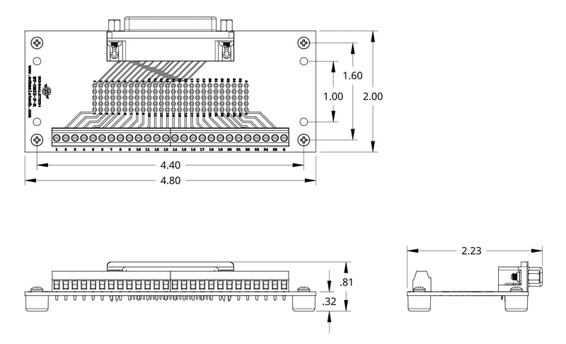 This female DB25 breakout board provides a convenient method of accessing all the contacts of a 25 pin D-Sub connector. Each of the 25 connections as well as the shield are brought out to a screw terminal for fast and secure termination to wires. This board also features a prototyping area to enable in-circuit modifications as well as easy probing/diagnostics. The prototyping grid has a standard 0.1" pattern to enable compatibility with a variety of components. The rubber feet on this model provide clearance for the connections on the bottom making it perfect for a lab environment where it can be placed directly on a bench.
