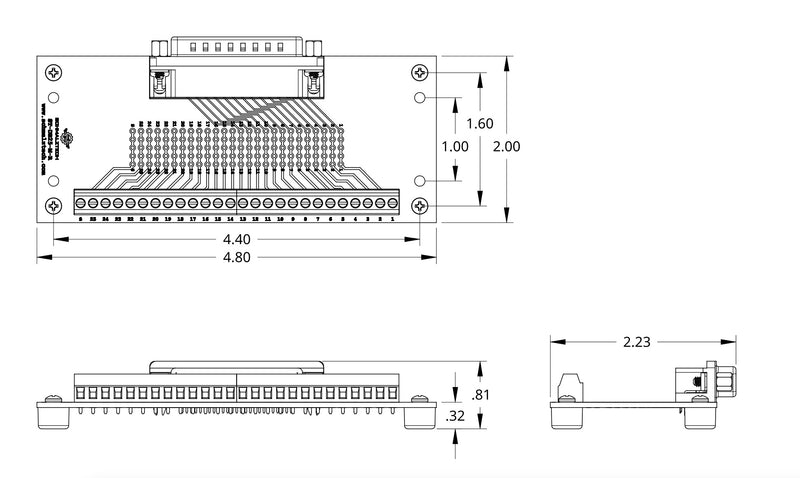 This male DB25 breakout board provides a convenient method of accessing all the contacts of a 25-pin D-Sub connector. Each of the 25 connections as well as the shield are brought out to a screw terminal for fast and secure termination to wires. This board also features a prototyping area to enable in-circuit modifications as well as easy probing/diagnostics. The prototyping grid has a standard 0.1" pattern to enable compatibility with a variety of components. The rubber feet on this model provide clearance for the connections on the bottom making it perfect for a lab environment where it can be placed directly on a bench.