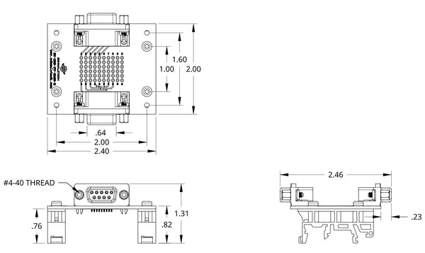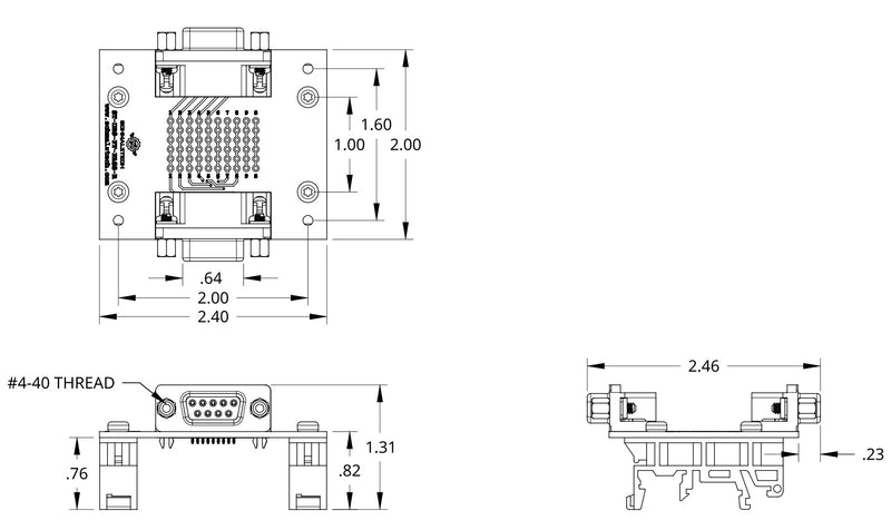 This female-to-female DB9 pass-through breakout board provides a convenient method of accessing all the contacts of a 9-pin D-Sub connector. Each of the 9 connections as well as the shield are brought out to a prototyping area to enable in-circuit modifications as well as easy probing and diagnostics. The prototyping grid has a standard 0.1" pattern to enable compatibility with a variety of components. The DIN clips on this model allow it to be easily used with a 35mm DIN rail system, making this board perfect for industrial applications.