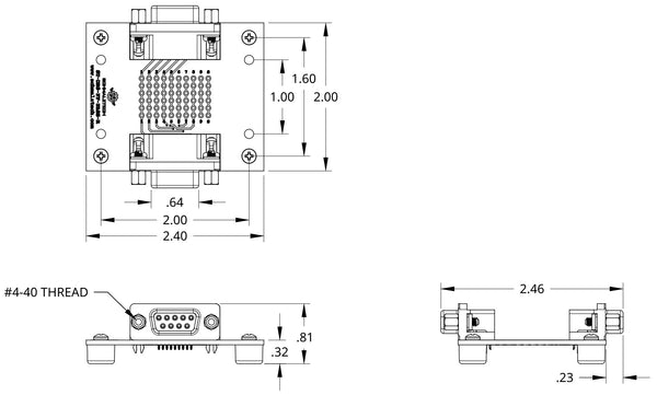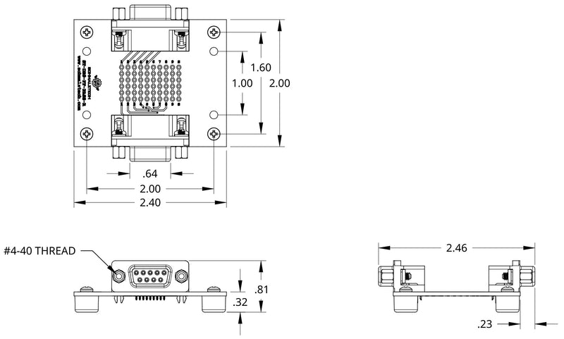 This female-to-female DB9 pass-through breakout board provides a convenient method of accessing all the contacts of a 9-pin D-Sub connector. Each of the 9 connections as well as the shield are brought out to a prototyping area to enable in-circuit modifications as well as easy probing and diagnostics. The prototyping grid has a standard 0.1" pattern to enable compatibility with a variety of components. The rubber feet on this model provide clearance for the connections on the bottom making it perfect for a lab environment where it can be placed directly on a bench.