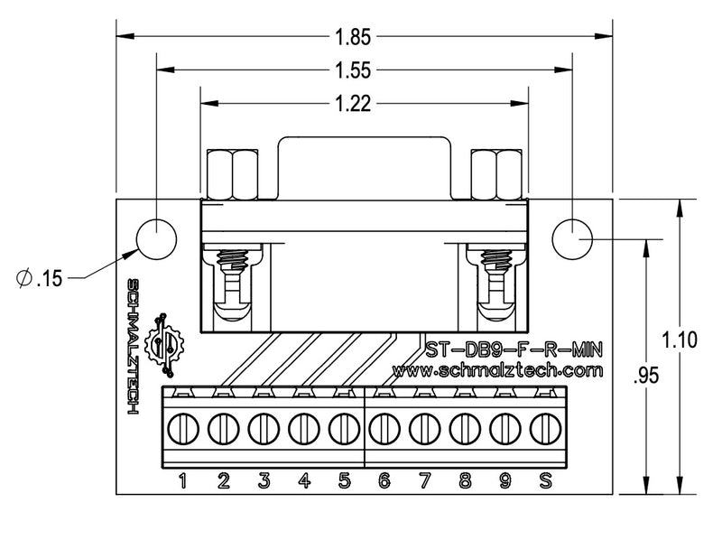 This female DB9 breakout board provides a convenient method of accessing all the contacts of a 9-pin D-Sub connector. Each of the 9 connections as well as the shield are brought out to a screw terminal for fast and secure termination to wires. This board was designed to be as small as possible while still breaking out all of the contacts of the DB9 connectors to screw terminals. This compact form factor will fit in tight spaces and has mounting holes to allow it to be securely fastened ensuring a solid connection in any project. The DB9 connector on this board also features removable threaded studs allowing it work with a wide variety of mating connectors.