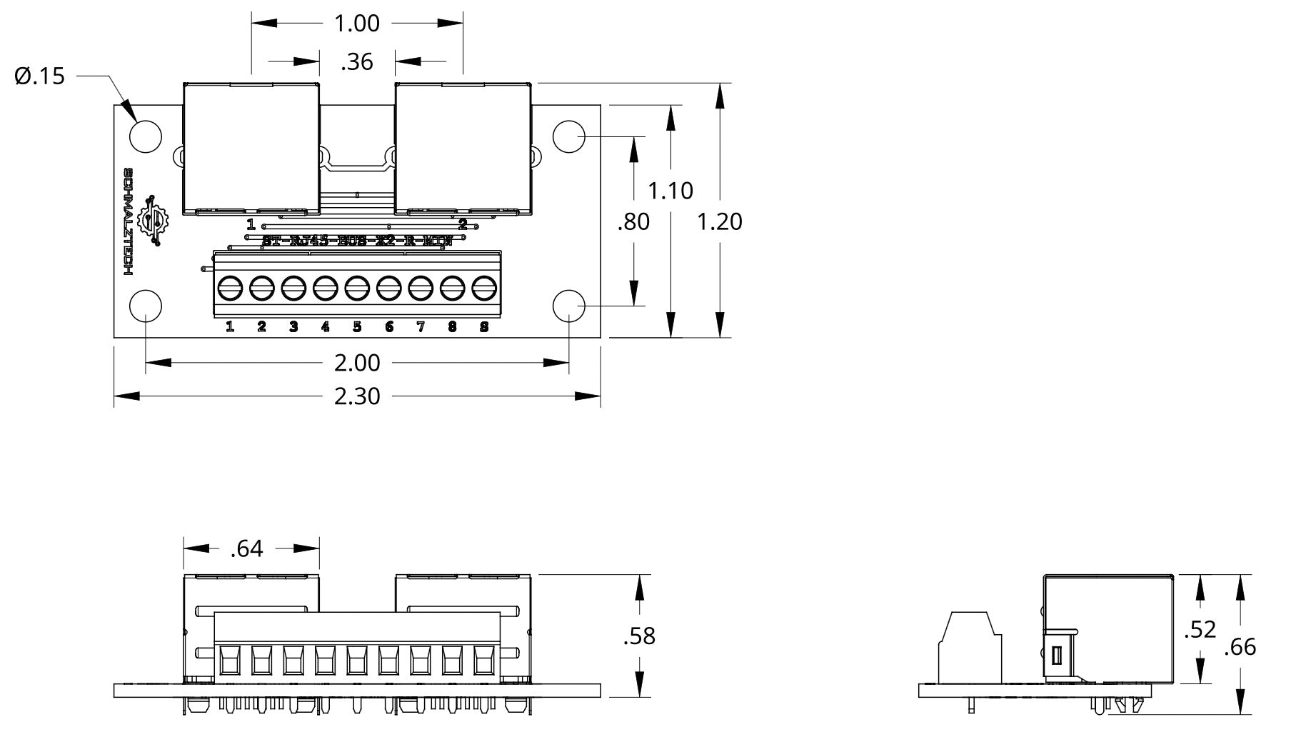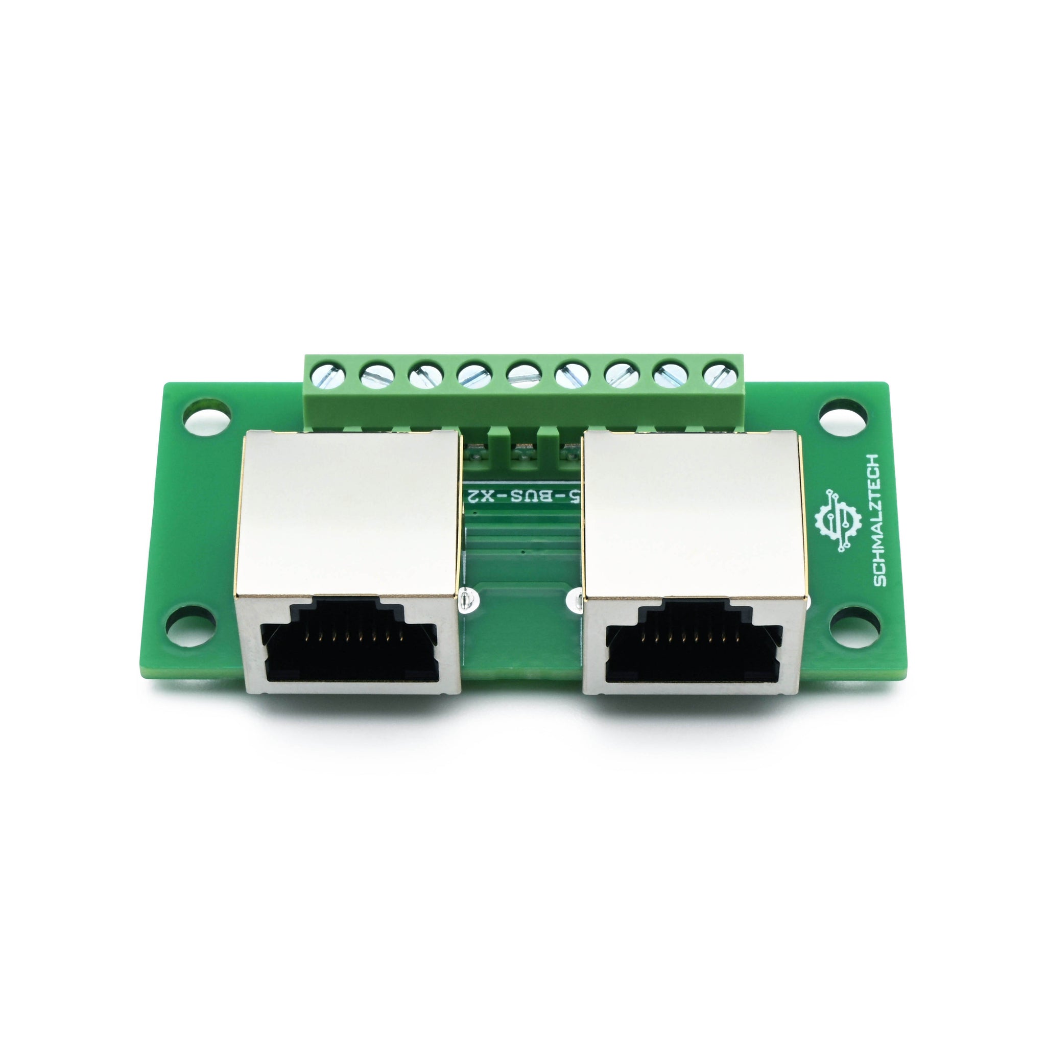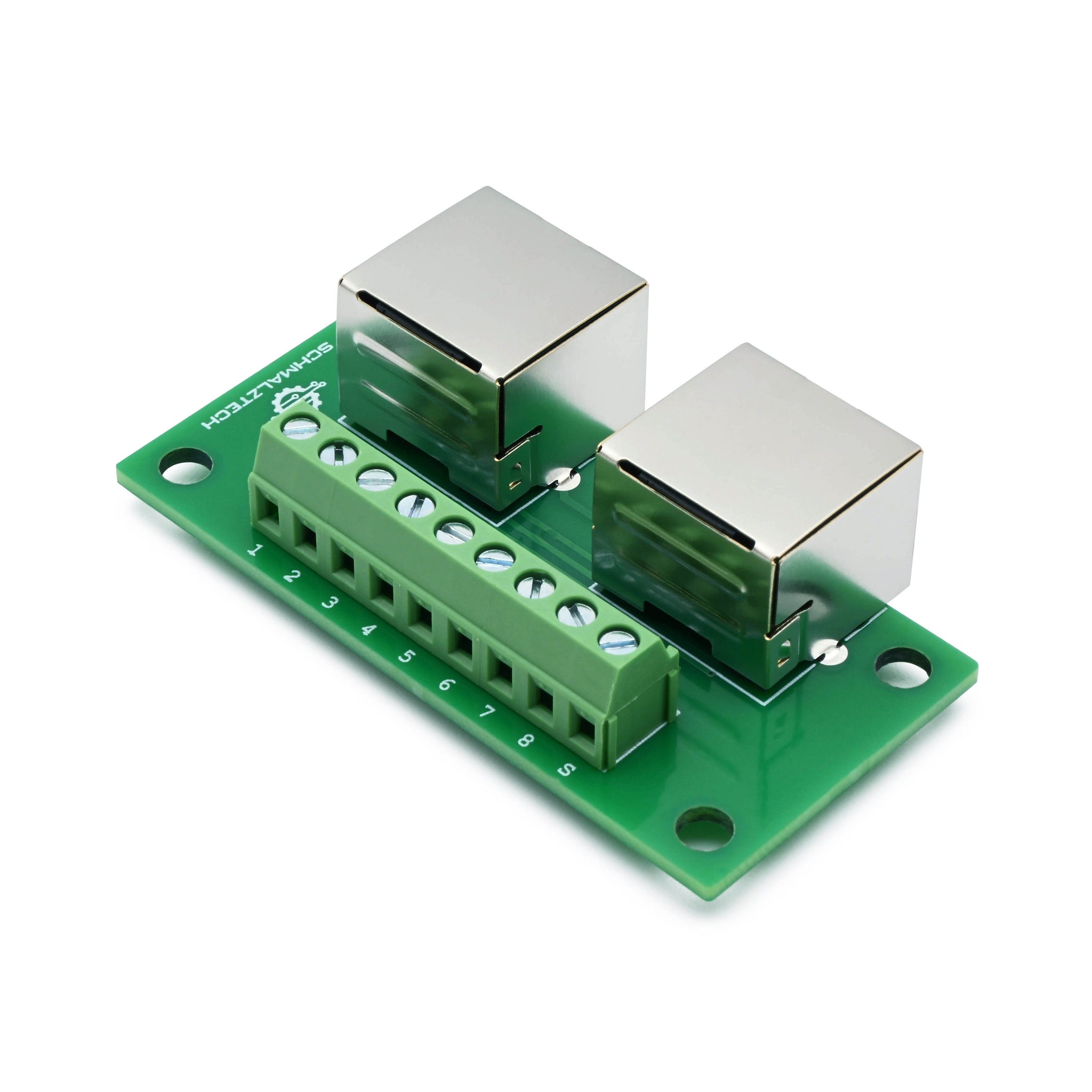 This RJ45 bus board breakout provides a parallel connection between multiple RJ45 connectors as well as a convenient method of accessing all the contacts of an 8P8C connector, including the shield. Each of the 9 connections are brought out to a screw terminal for fast and secure termination to wires. This board is a great way to quickly pass electrical signals to multiple devices through common RJ45 connections. It can also be used as a fast and robust way to daisy-chain devices. This compact form factor will fit in tight spaces and has mounting holes that allow it to be securely fastened, ensuring a stable connection.