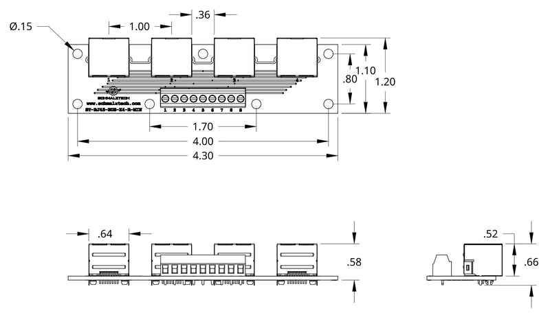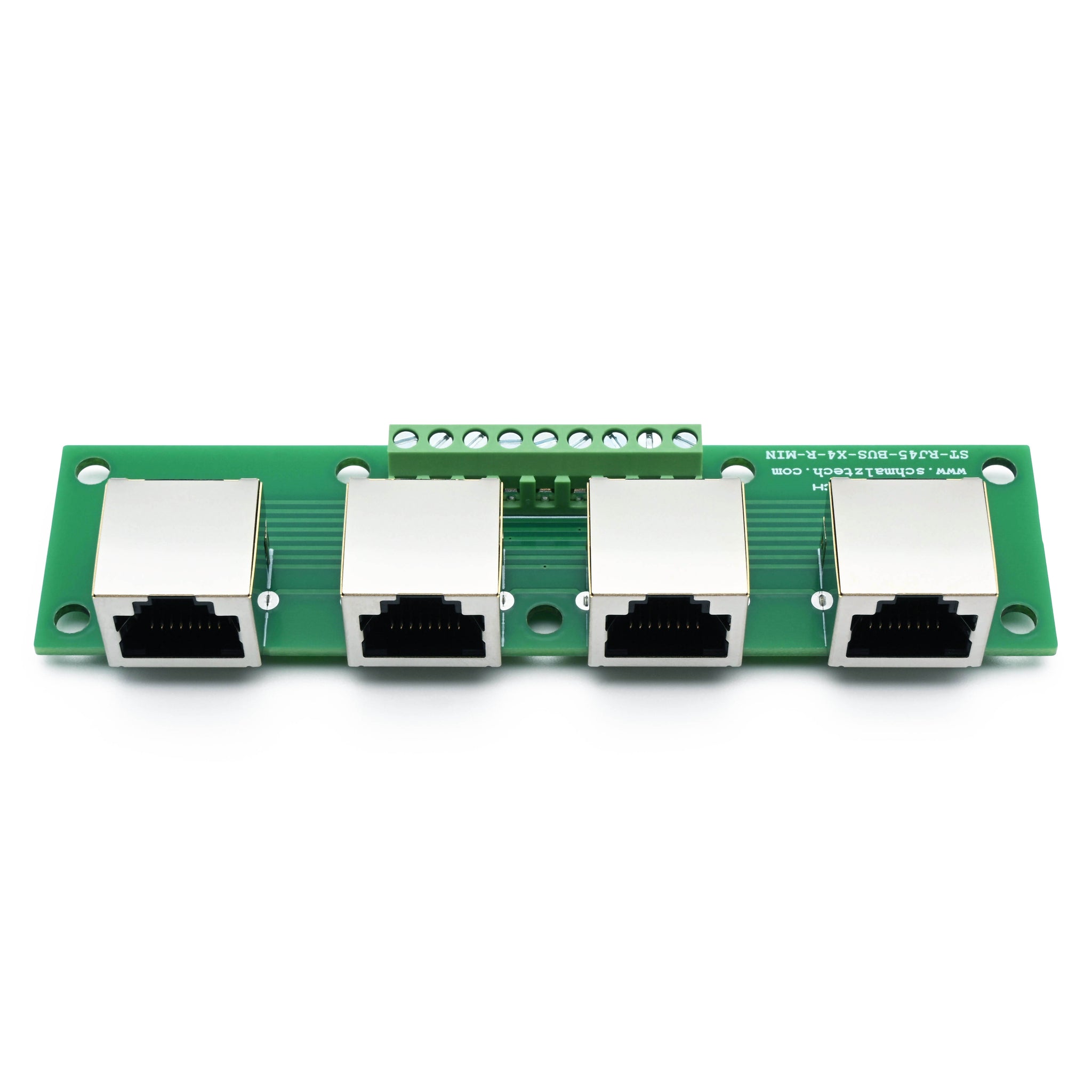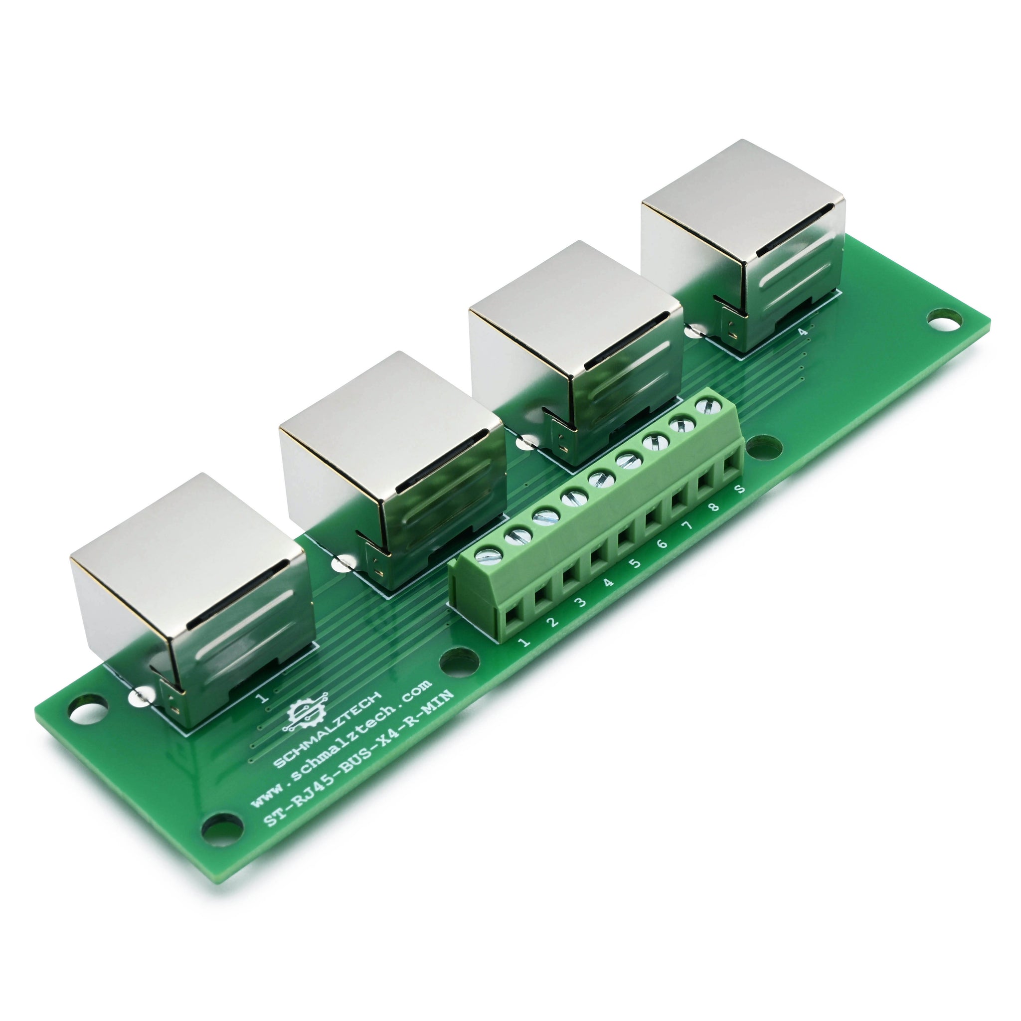 This RJ45 bus board breakout provides a parallel connection between multiple RJ45 connectors as well as a convenient method of accessing all the contacts of an 8P8C connector, including the shield. Each of the 9 connections are brought out to a screw terminal for fast and secure termination to wires. This board is a great way to quickly pass electrical signals to multiple devices through common RJ45 connections. It can also be used as a fast and robust way to daisy-chain devices. This compact form factor will fit in tight spaces and has mounting holes that allow it to be securely fastened, ensuring a stable connection.