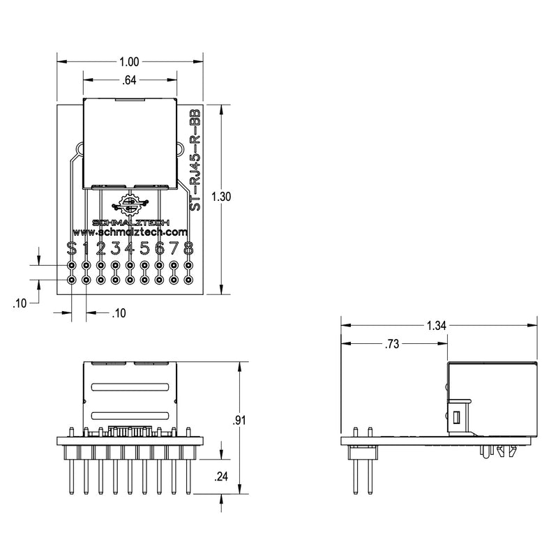 This RJ45 breadboard breakout provides a quick and easy method of accessing all the contacts of an 8P8C connector, including the shield. Each of the 9 connections are brought out to a pair of pin headers that can connect directly to a standard breadboard. This board has two rows of 0.1" male pin headers to create a more stable connection to the breadboard. By providing a second row of headers, the breakout board is less likely to work loose from the breadboard and can better support the weight of a connected cable.