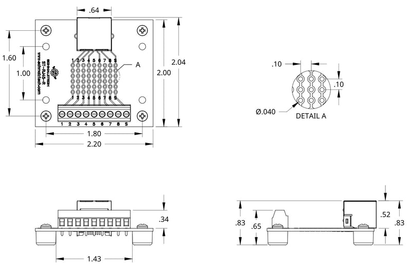 This RJ45 breakout board provides a convenient method of accessing all the contacts of an 8P8C connector, including the shield. Each of the 9 connections are brought out to a screw terminal for fast and secure termination to wires. This board also features a prototyping area to enable in-circuit modifications as well as easy probing/diagnostics. The prototyping grid has a standard 0.1" pattern to enable compatibility with a variety of components. The rubber feet on this model provide clearance for the connections on the bottom making it perfect for a lab environment where it can be placed directly on a bench.