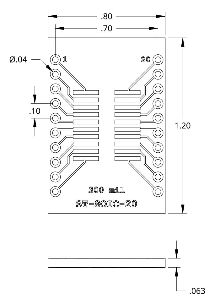 - Converts SOIC-20 / SOP-20 SMD parts to a DIP form factor