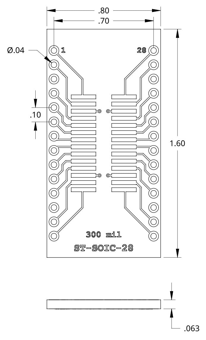 - Converts SOIC-28 / SOP-28 SMD parts to a DIP form factor